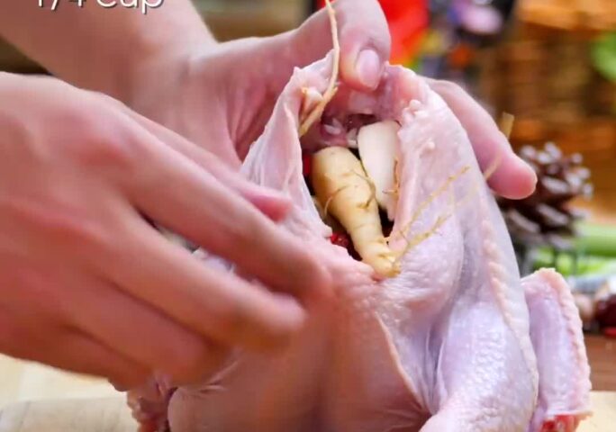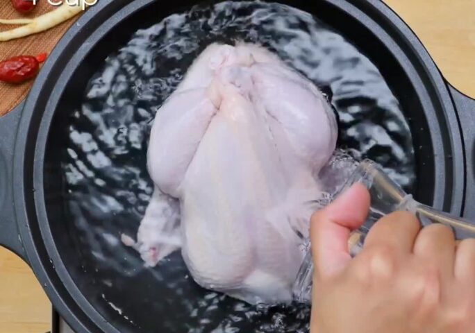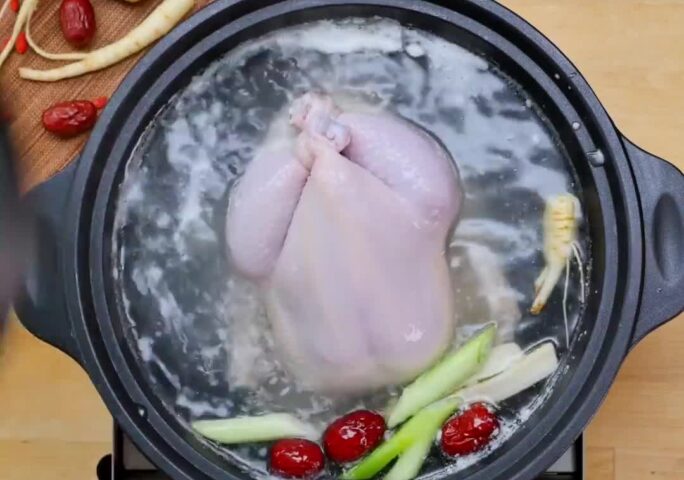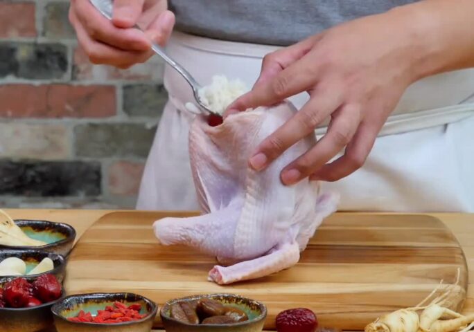 Stuff the chicken cavity with 2 garlic cloves, 4 red dates(jujubes), 1/4 cup ginseng, and 2 tbsp soaked sticky rice.