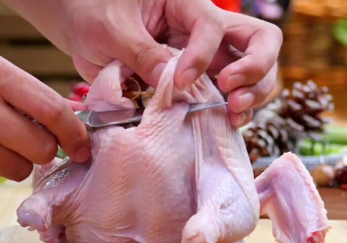 Cross the legs and tie together with kitchen twine. Tightly close the cavity with a toothpick if necessary.