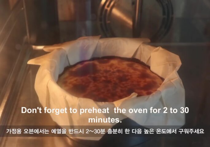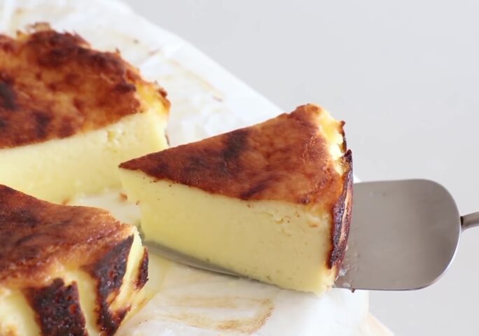 Today’s video is a Basque cheesecake. This cake was first made at a restaurant called La Vina in Basque, Spain. The difference compared with other cheesecakes is that it has no acidity, and it has a smoky flavor because it bakes at high temperatures like it is scorching the surface. I don’t use any flour, so it melts more smoothly in the mouth. And you can also feel the unique taste of cream cheese. The ingredients are simple and the process is easy, but the taste is good. I’d like to recommend that you make it. The unique flavor of this Basque cheesecake is from baking like burning a cake at a high temperature. Be sure to preheat the oven enough and bake at a high temperature!