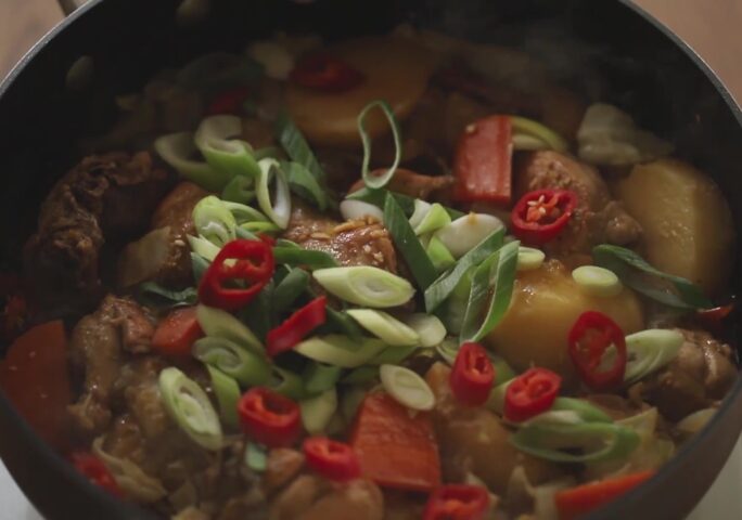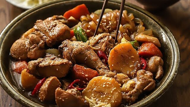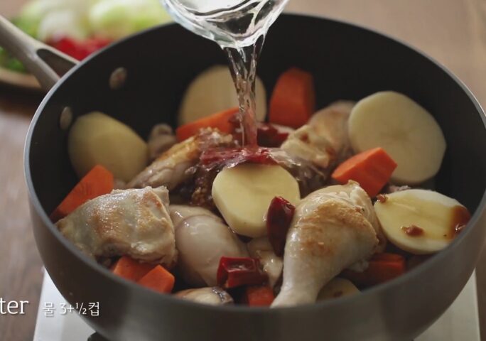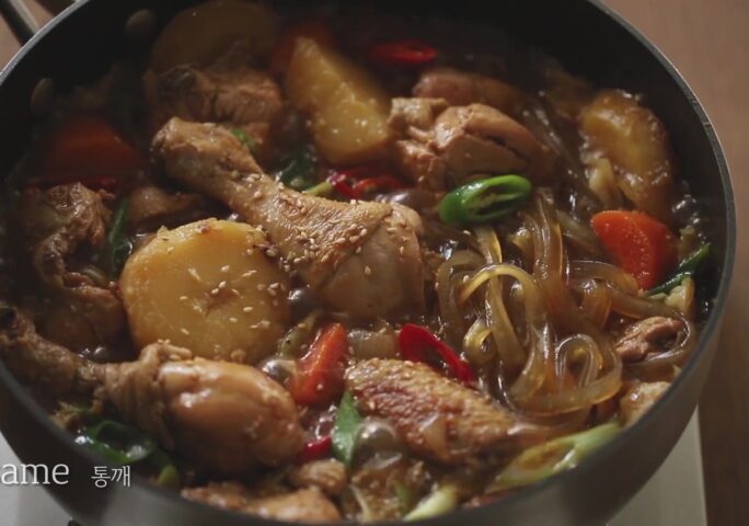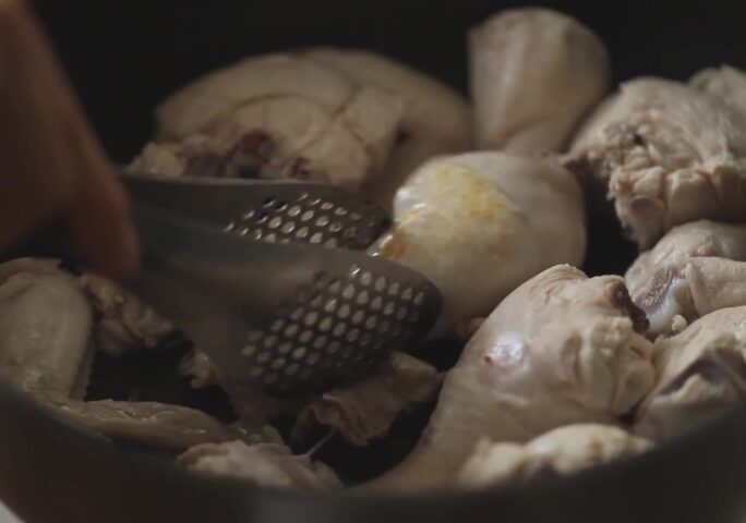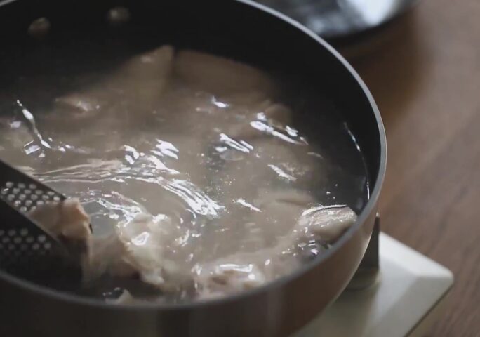 Dip chicken in milk for 20 minutes to drain blood. Soak the glass noodles in cold water for 15 minutes. Blanch the chicken in boiling water for 30 seconds to 1 minute and rinse it in cold water. Then remove water with a kitchen towel.