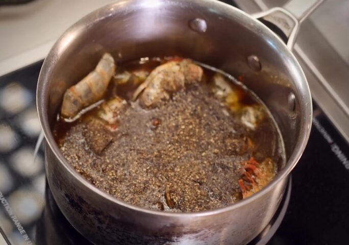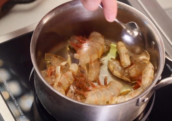 Heat olive oil in a smaller pan, add shrimp shells, and sautee it together.