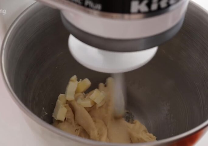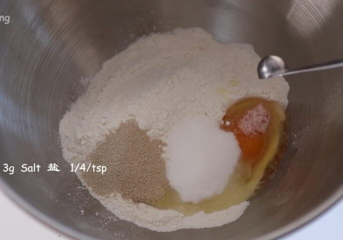 In a mixing bowl, combine bread flour, egg, instant yeast, salt, and sugar. Gradually add most of the ice milk, reserving a small amount, about 1 tbsp, for later.