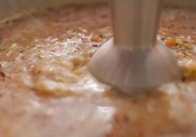 Remove from the heat, and with a 6 or 8 oz ladle scoop out 1 or 2 ladles of the soup (mostly lentils) in another heat-proof container, and blend what is left in the pot with an immersion blender to your preferred consistency. We have blended until silky and smooth.