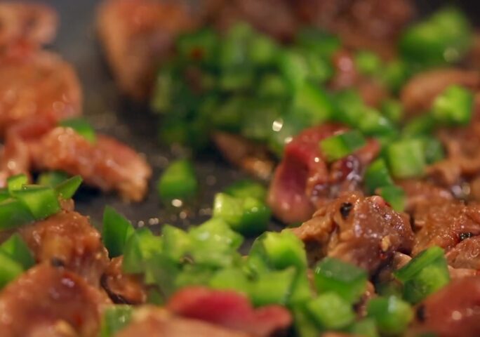 Warm tortillas sizzle softly in the pan, filling the air with the comforting scent of toasted corn. Meanwhile, tender buffalo slices cook to perfection, releasing a hearty aroma that mingles with the vibrant heat of fresh jalapeños. As the buffalo is layered onto the tortillas, it’s generously topped with a fusion of spicy chili aioli, tangy blue cheese dressing, and a touch of sweet ketchup, each bite promising a burst of bold flavors.