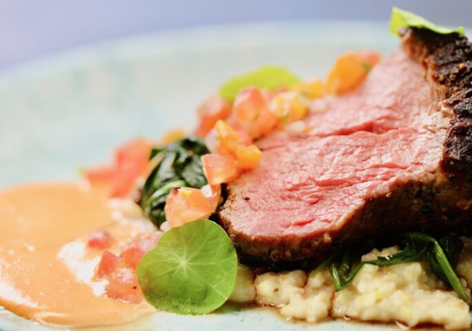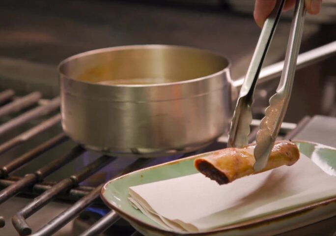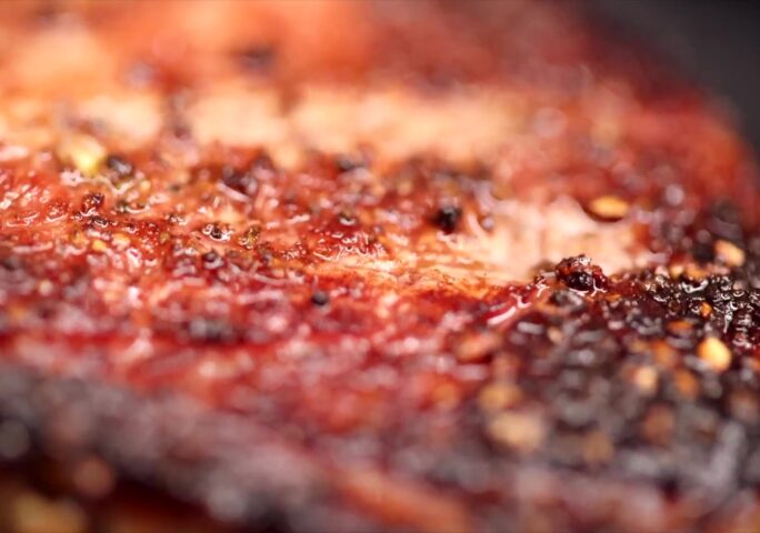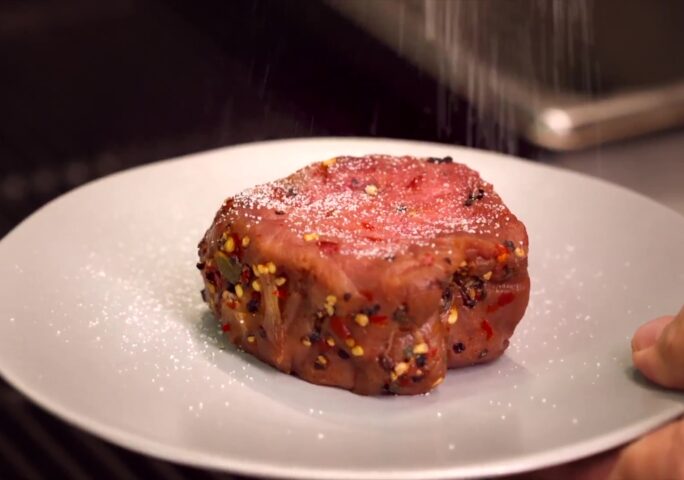 Take the tenderloin marinated for 48 hours in maple syrup, black pepper, red pepper flakes, sage, thyme, shallot, and garlic.