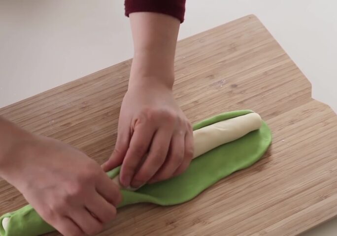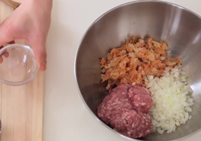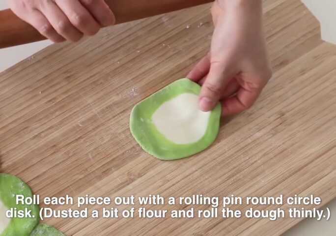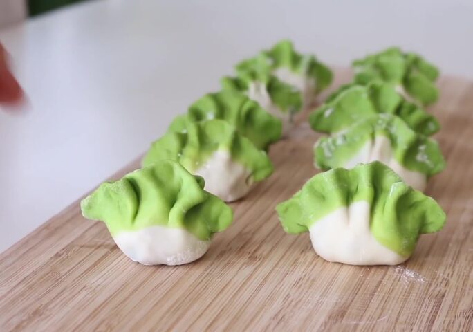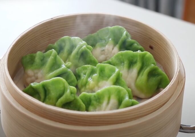 Chop the chives. Mince Napa cabbage kimchi and onion and drain. Combine ground pork, chopped kimchi, onion, chives, and filling sauce in a large bowl. Take leaves from 4 stalks of spinach and put them into the blender with 1/2 cup water. Remove the pulp using a fine mesh strainer to make spinach juice.