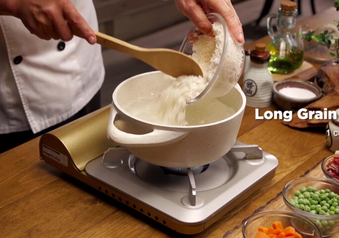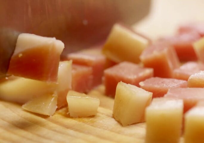 First, dice the ham and carrots for later use. Wash the basmati rice for later use without soaking.