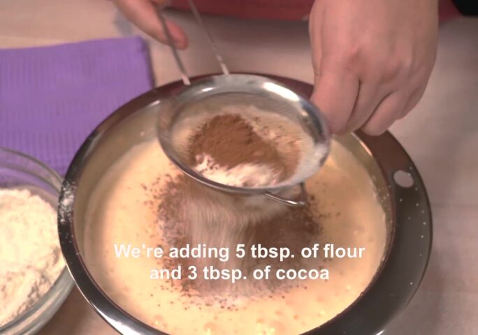 To that sift 5 tbsp. of flour and 3 tbsp. of cocoa