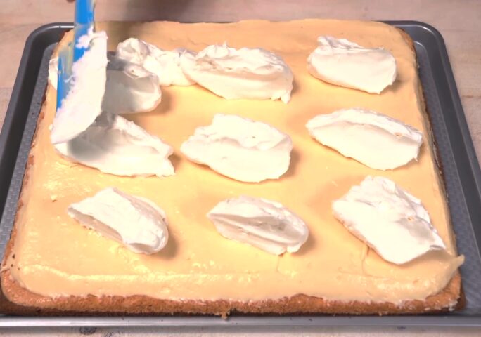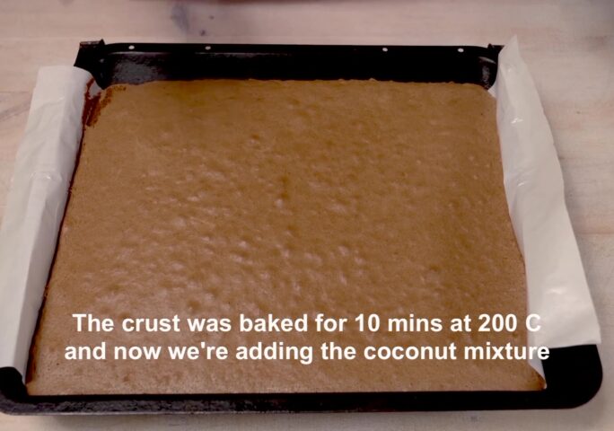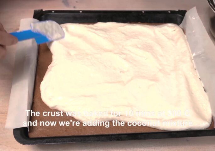 Now that we put the coconut filling on the top of the crust, put it back in the oven.