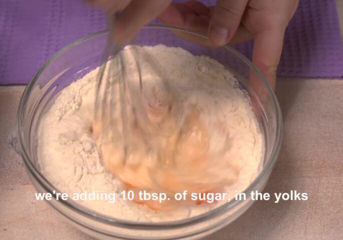 Separate 5 egg whites from the yolks for the egg whites, we're adding 8 tbsp of sugar and we are going to mix everything.