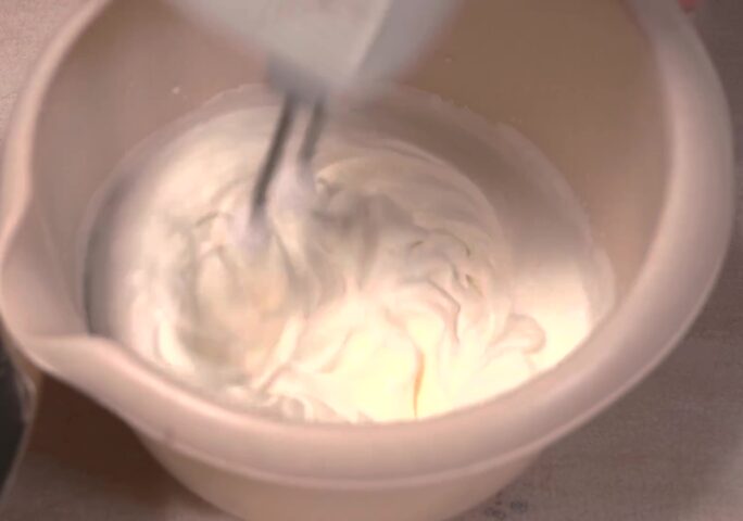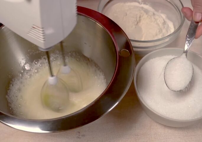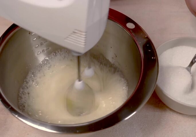 Whip all 5 egg whites while adding 8 tbsp of sugar.