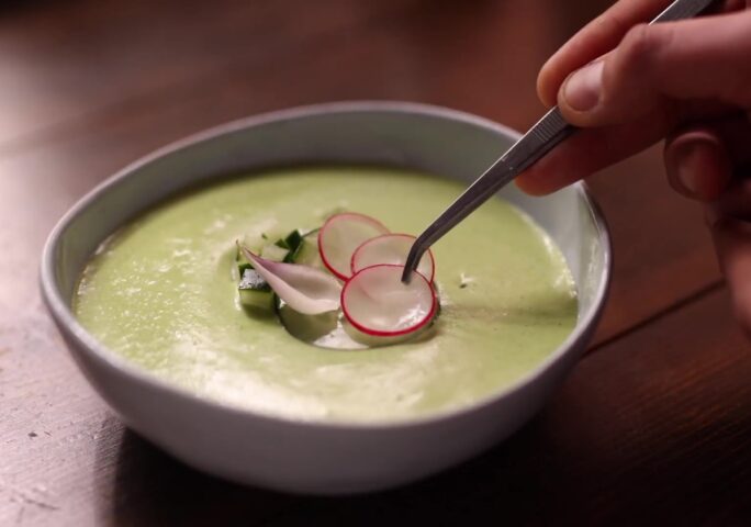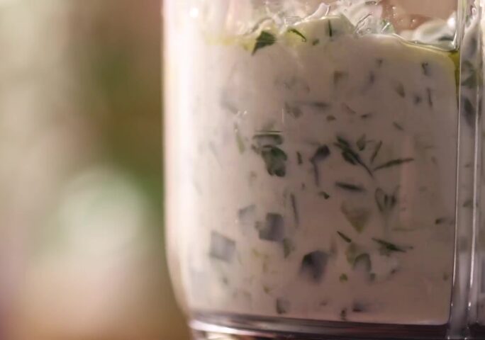 In a blender, combine the chopped cucumber with the yogurt, lemon juice, pearl onion, garlic, dill, parsley, tarragon, and 1/4 cup of olive oil. Blend until smooth. Season with salt and white pepper, cover, and refrigerate for at least 8 hours or overnight.