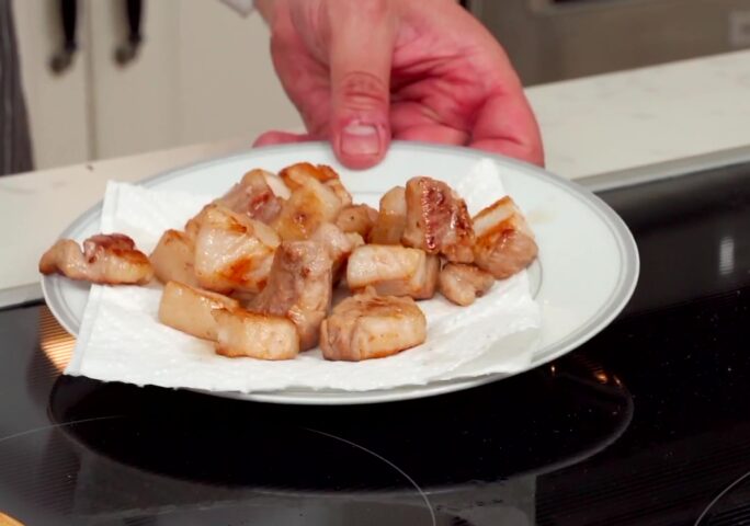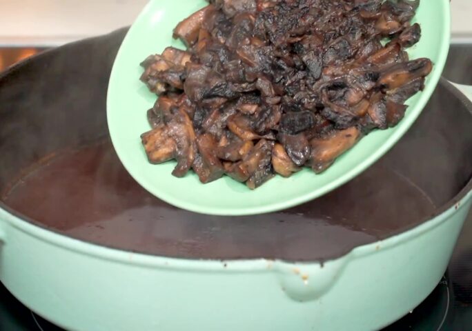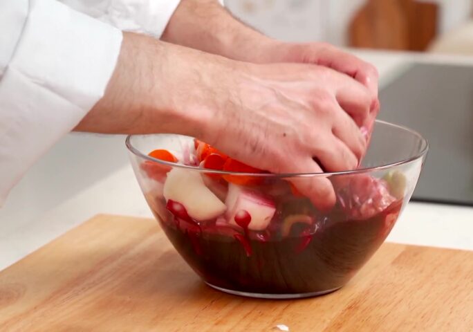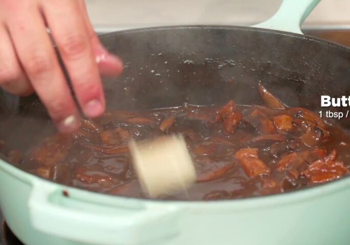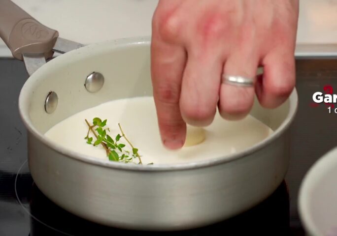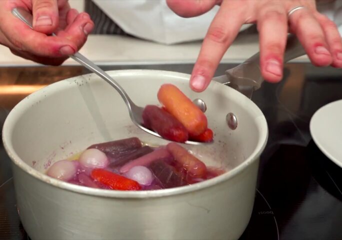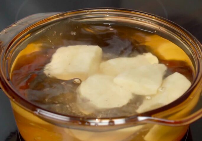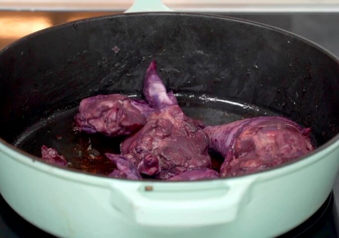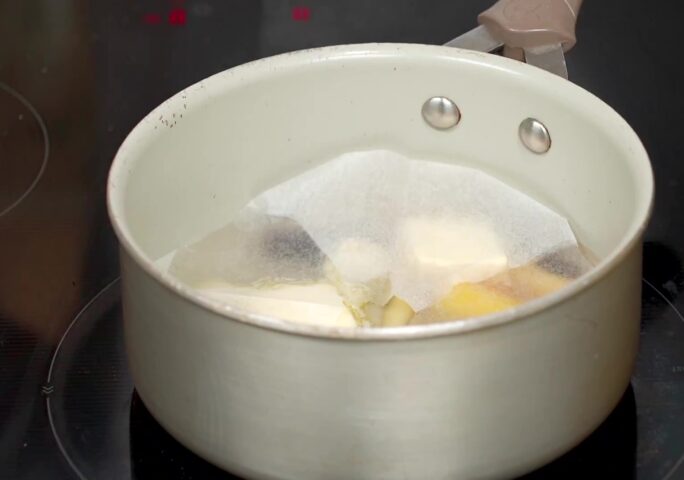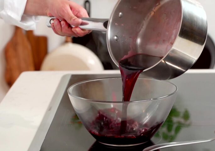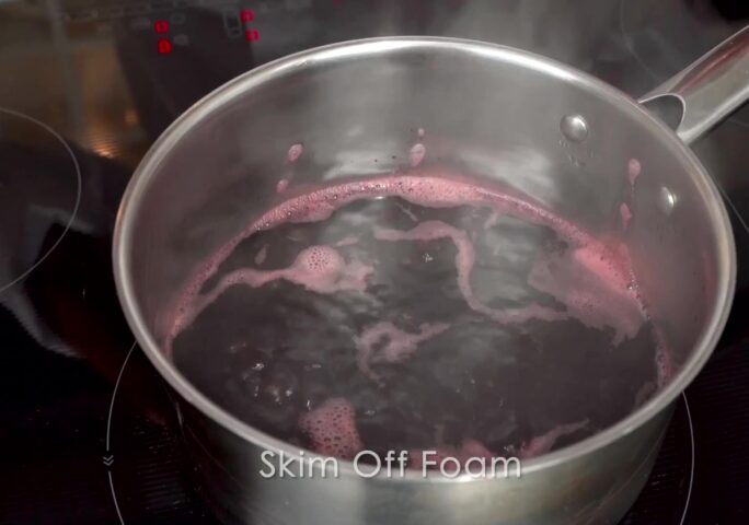 Bring a saucepan to low heat, pour the red wine into the pan, and simmer for about 20 minutes. During the simmering, skim off the foam on the surface of the red wine.