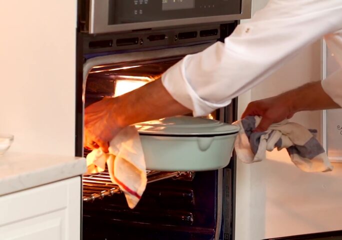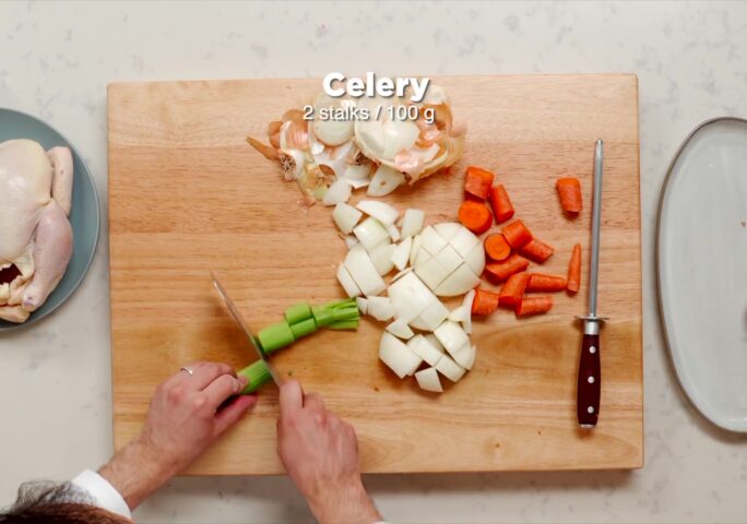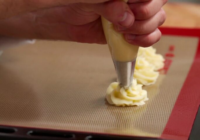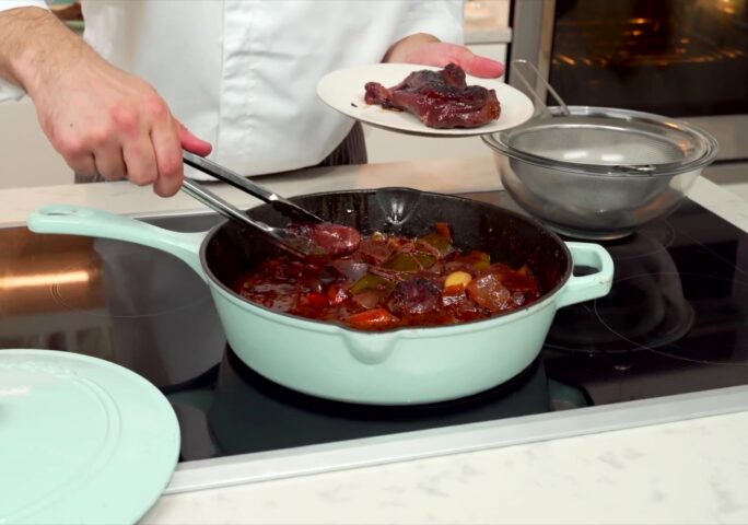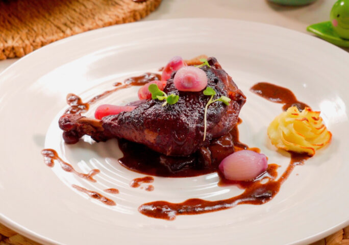 Coq au Vin With a Side of Duchess Potato a classic French dish that creates a brand new chicken experience. This braised chicken in wine with baked potatoe roses and braised vegetables all in a harmony a flavors. Perfect for a dinner party!