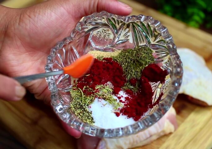 Mix together the salt, pepper, garlic and onion powder, thyme, rosemary, and paprika.