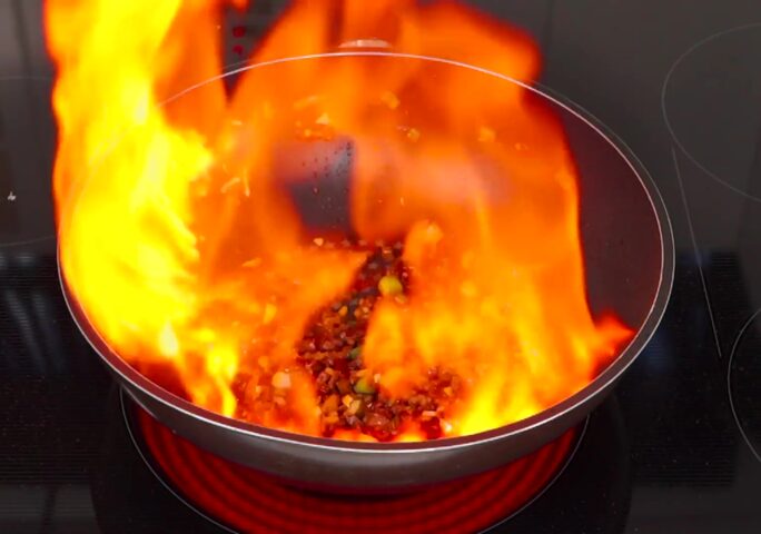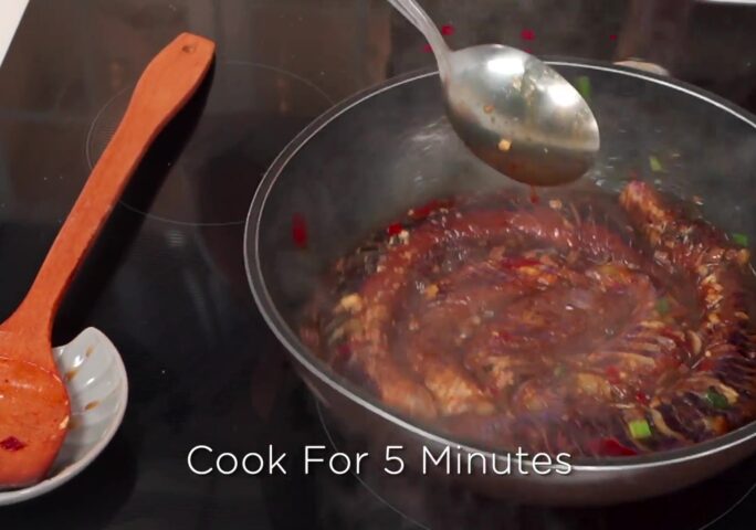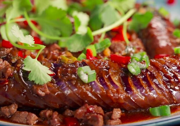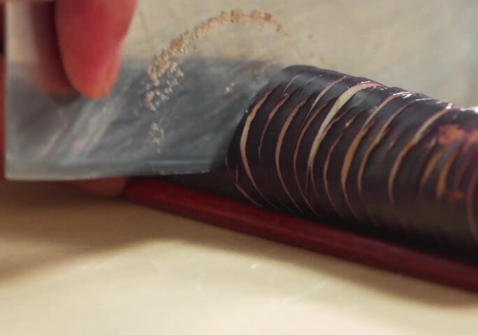 Cut the eggplant into spirals by keeping the whole eggplant together. You can use the chopsticks to stop the knife from cutting all the way through. The chopsticks are like a ruler to ensure the eggplant can connect together as shown in the video.