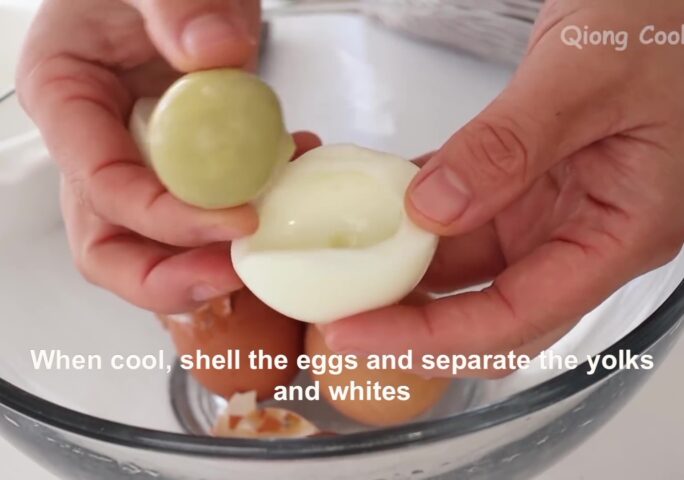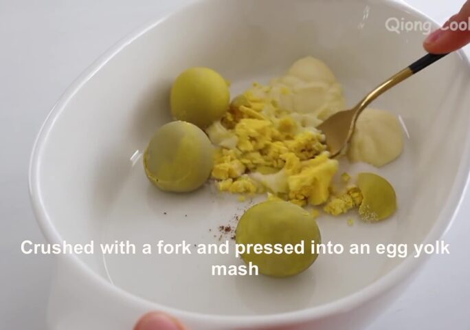 Add mayonnaise to the egg yolks, sugar, a pinch of salt, and a pinch of pepper powder. Crushed with a fork and pressed into an egg yolk mash.