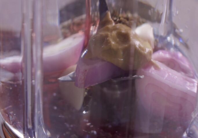 First make your dressing by combining the ingredients above (except the oil) in a stand mixer and gradually turn on the mixer to high speed, with the middle of the lid opened drizzle in the olive oil slowly to emulsify.