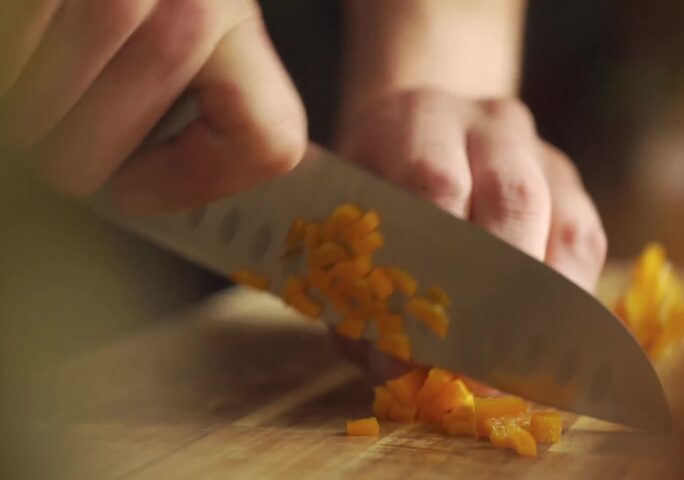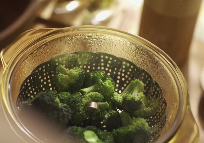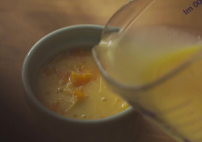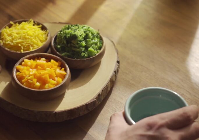For the first 4 regular muffins add the cooked broccoli, brunoise peppers, and cheddar in equal parts into 4 of your 12 muffin molds.