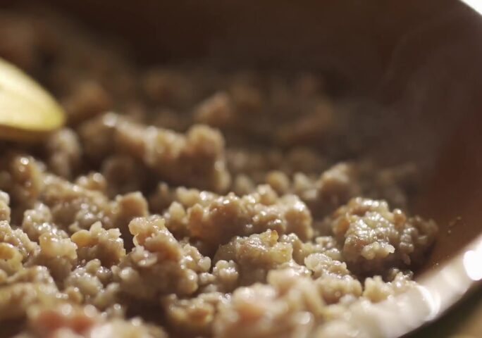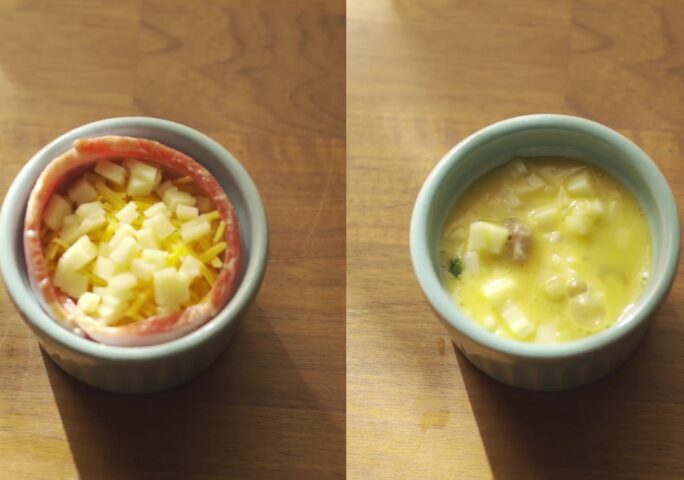 Also, make sure you squish all the ingredients right into the muffin molds (of the tray you are using) up to a fourth of an inch from the top edge (90% full approx.) Cover with more egg wash, just enough to cover your ingredients. NOTE: Do NOT fill up to the top because the muffin will increase in volume and overflow during cooking time. Repeat the same steps (10 to 12) to compose the 4 muffins we will use for our muffin sliders, but use the other ingredients in the ingredients section (the sausage you have cooked, kale, and swiss cheese).