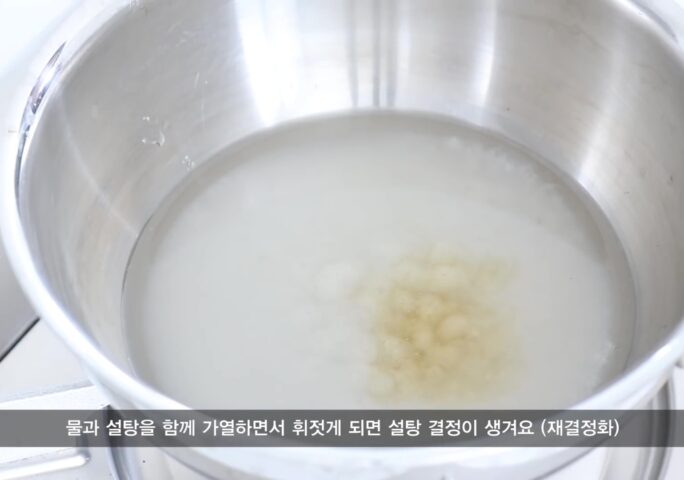 Put water, sugar, corn syrup, and honey, in a pot and heat it without stirring.