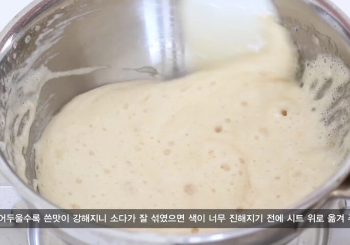 Stir with a spatula until baking soda mixes thoroughly with the dough. And remove it from the pot immediately before it gets dark.