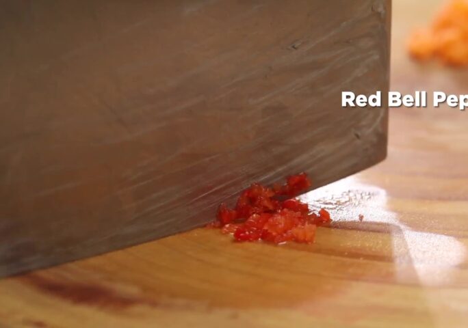 First chop ginger, green onion, bell pepper, and carrots and put them in a bowl for later use. Chop the shrimp and put it aside.