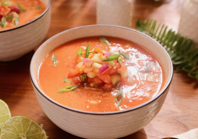 Delicious cold soup from fresh vegetables! A Mediterranean dish that is not just tasty but also perfectly fits your weight loss goals! It is a low-calorie nutritious dish that is rich in fiber, which facilitates intestinal transit and elimination of toxins.