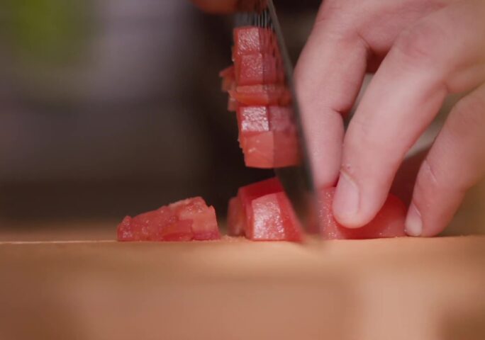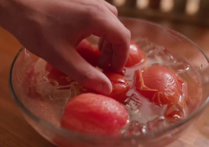 Fill a 6-quart pot halfway full of water, set over high heat, and bring to a boil. Also prepare a bowl with an ice bath big enough to fit the tomatoes.