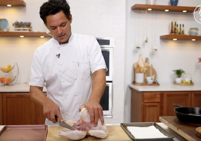Cutting a whole chicken is easier than you think! Watch Chef Nick’s video tutorial for how to cut a whole chicken and learn how to debone a chicken!
