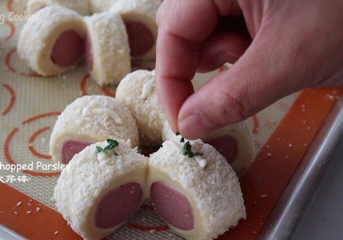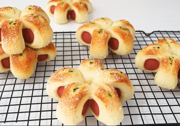 These easy, delicious and beautiful Hot Dog Buns are a new way of preparing a frankfurter. The light dough with parmesan coating hides the frankfurter which with 4 cuts forms a flower. Combined with the mayonnaise it is perfect as breakfast or a snack. It is little a crunchy and also soft and tasty.