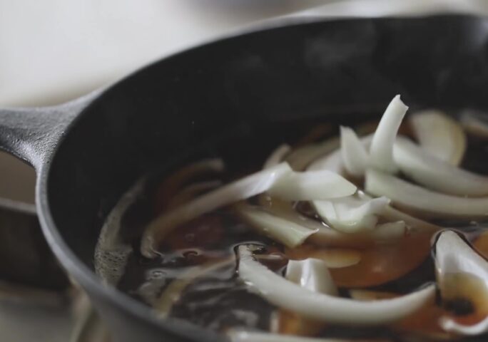 Slice the onion. Cut the enoki mushroom and the small green onion into bite sizes. Chop a bit of small green onion for garnish. In a small bowl, lightly beat the egg.
