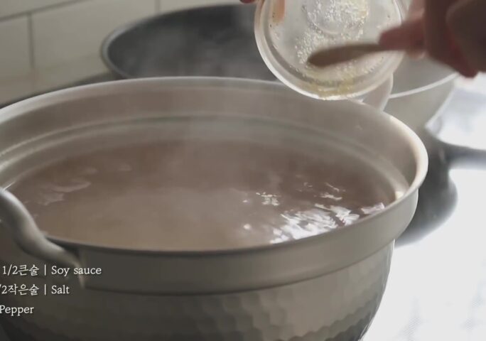Prepare a seafood stock. Add soy sauce, salt, and pepper to it.