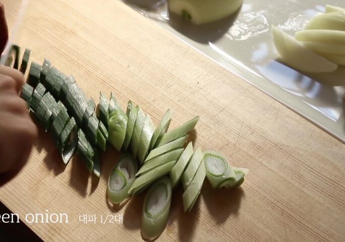 Cut the tofu and kimchi. Slice the green onion and onion.