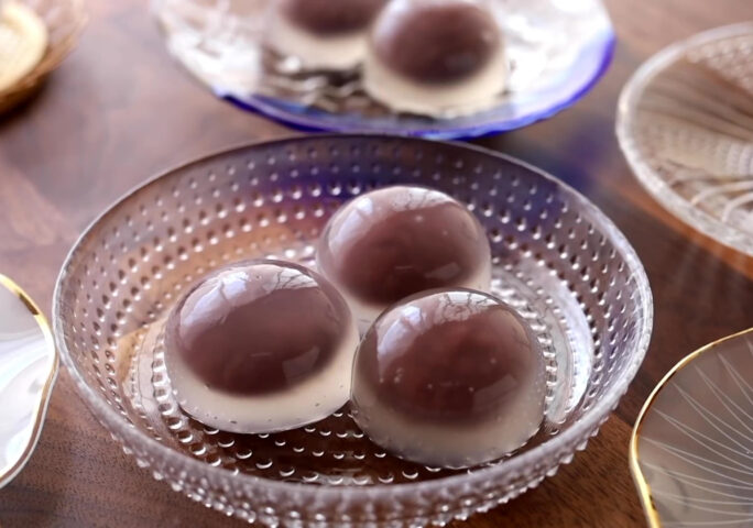 I made Mizu Manju for today’s snack. Mizu Manju is a Japanese sweet which is eaten during the summer simply put is red bean paste inside a clear jelly.