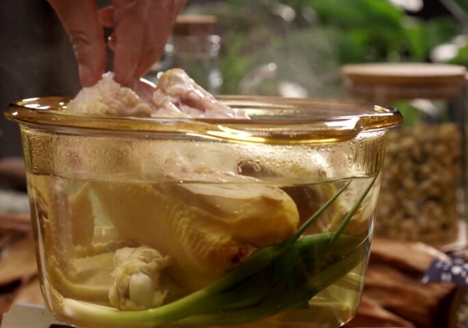 Place half of the ginger slices, water, chicken carcass, and green onions in a pot. Bring the mixture to a boil and simmer for 45-60 minutes.