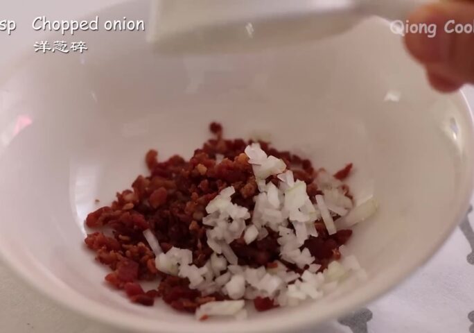 Mix bacon crumbles and chopped onion.