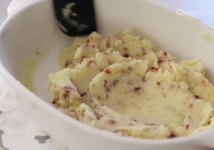 Pressed into mashed potatoes with a fork.