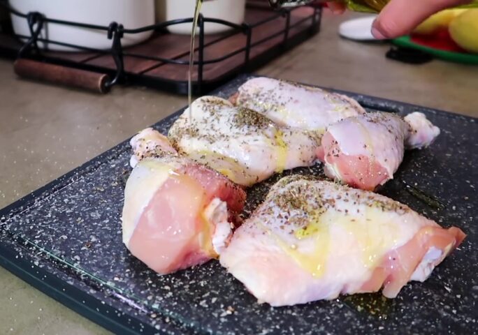 and salt and pepper. Drizzle half a tablespoon of olive oil all over your chicken