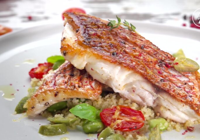 Pan-Seared Red Snapper is an easy and delicious dish for a dinner. Prepared simply on a pan and served with couscous and lemon sauce with olives it is light and simple. Try and enjoy this appetizing dish.
