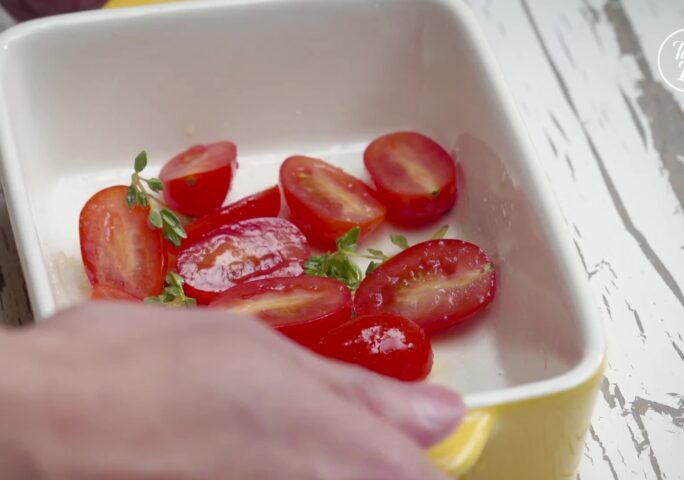 Cut the tomato to half, then place to a baking sheet then add olive oil, salt, and thyme, mix it up then put into the oven, bake at 380°F/190°C for 15 minutes.