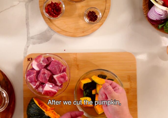 Cut the pumpkin into small pieces after removing the sac. Note: Please keep the pumpkin skin, which is very nutritious.