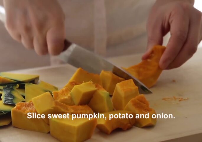 Peel the sweet pumpkin and potato. Slice sweet pumpkin, potato, and onion. (It’s easy to peel sweet pumpkin after microwaving for about 3 mins or steaming in a steamer for about 5mins).