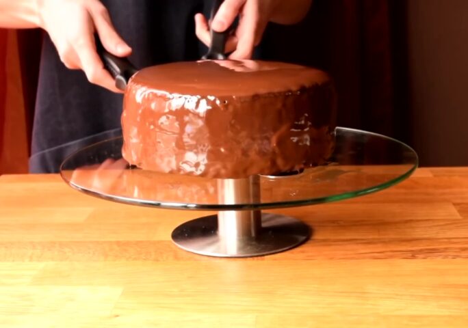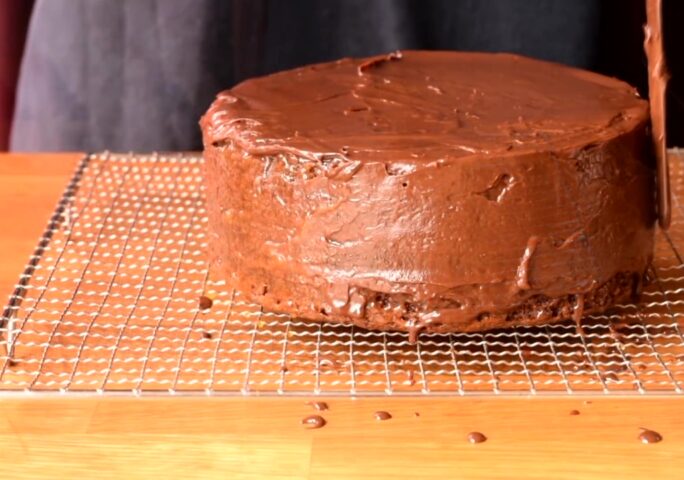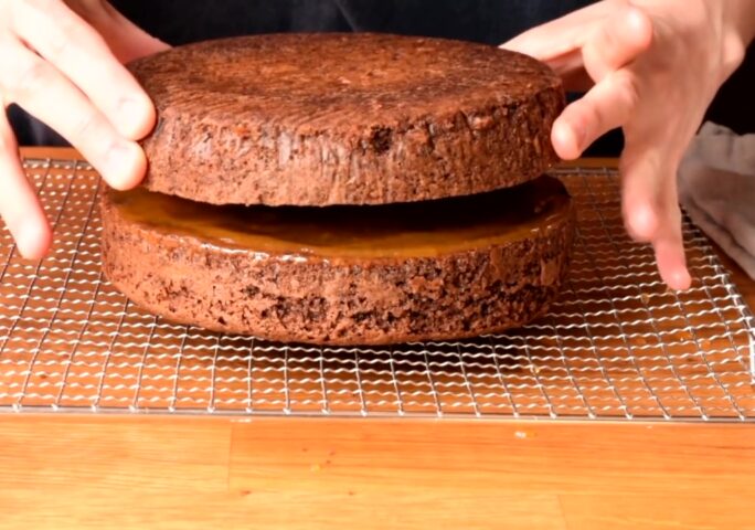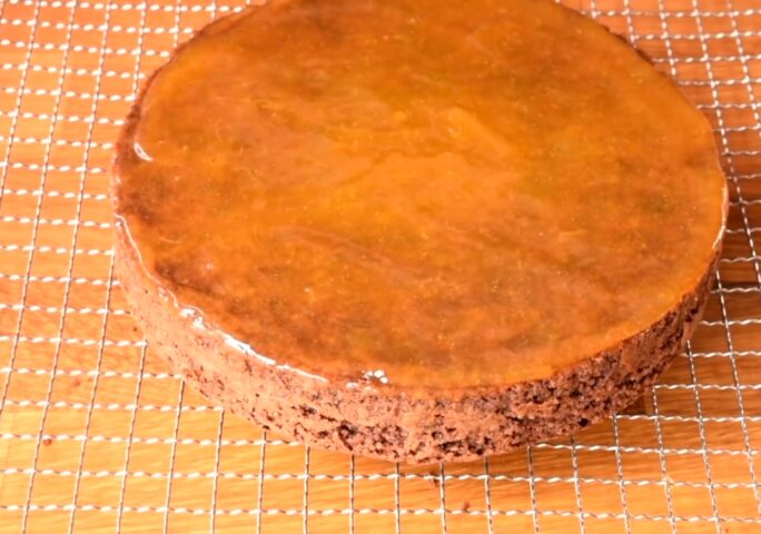 In a saucepan add the apricot jam and place at medium-low heat. Leave until it gets a little warm so that it takes on a more liquid texture. With the help of a layer cake cutter, cut the cake in half.