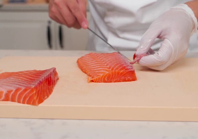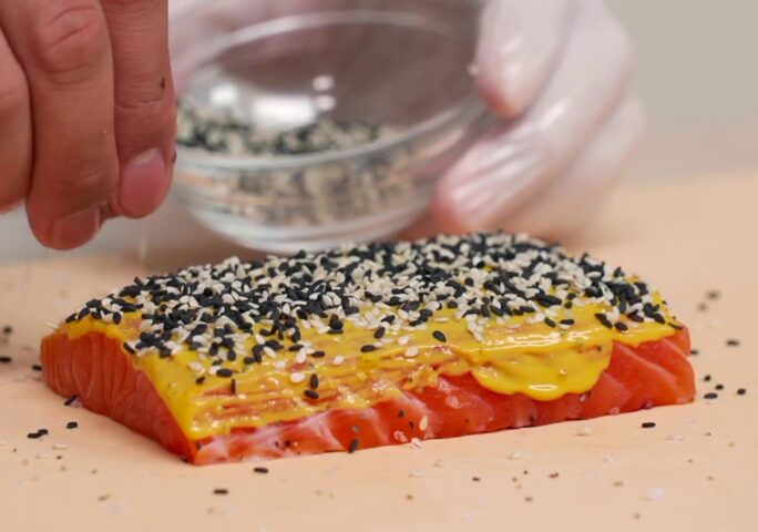 Salmon: Remove the excess skin on the salmon, then cut the salmon into 2 pieces. Prepare the yellow mustard and mixed white and black sesame.