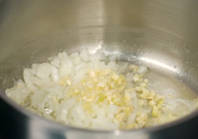 Sauce: Mince half of the white onion, minced garlic clove. Heat 2 Tbsp of butter in the pan, add minced onion and garlic to the pan, stir fry until translucent.