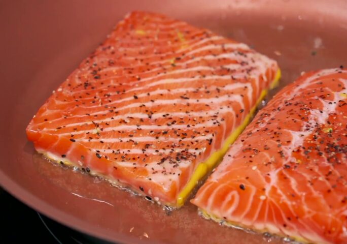 Bring a skillet on medium-high heat, add vegetable oil, sear the salmon sesame side down, until the sesame becomes golden brown, flip the salmon keep searing until the salmon is cooked.