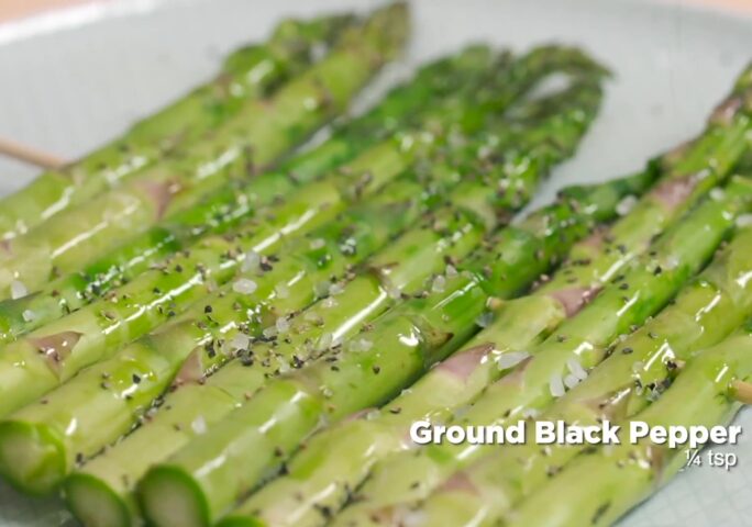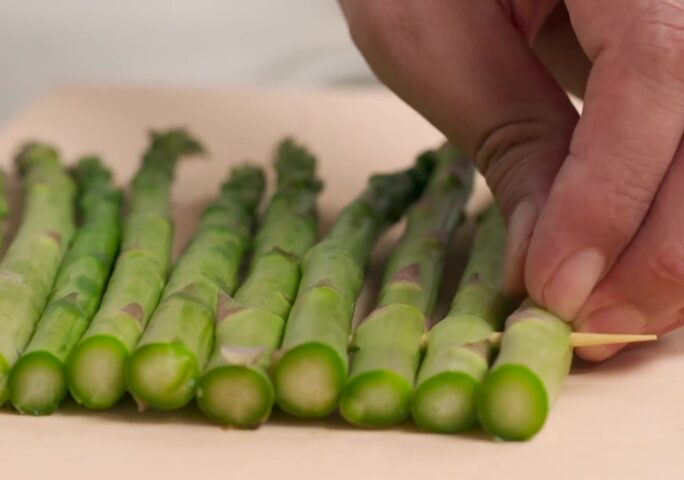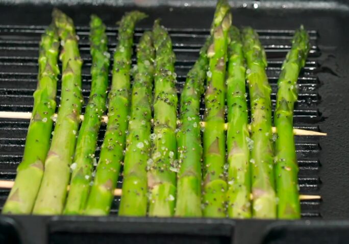 Asparagus: Heat a cast-iron pan on high heat. Trim off the hard end part then skewer the asparagus, it will be easy to flip and save more time on the grill. Tips: Because this pan has When grilling, do not need to add extra oil in the pan.