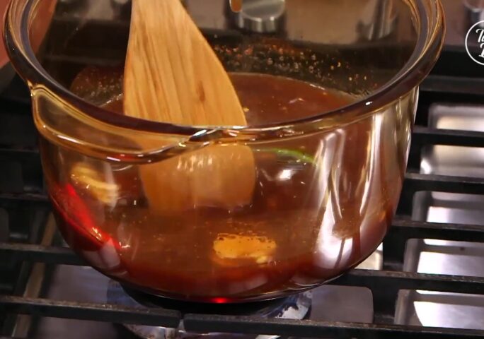 Next, make the sauce. Dissolve palm sugar and water in a pan add remaining liquids and chilis plus smashed garlic. Simmer for 20 minutes till the right consistency and flavor. Adjust taste accordingly.