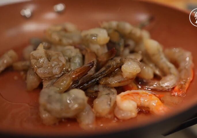 Quickly marinate the prawns: sesame oil, white pepper, lime juice, and fish sauce, and white sugar. Sear one side and kiss the other side then rest.